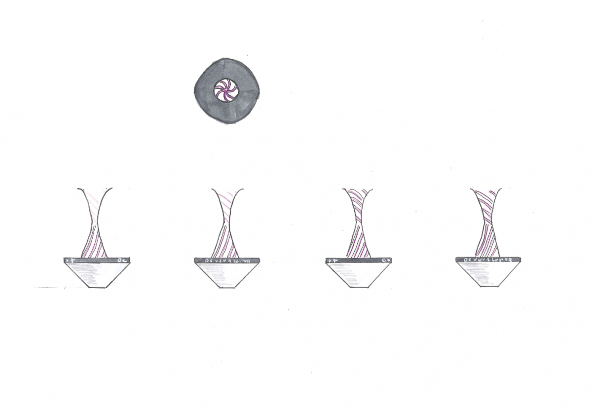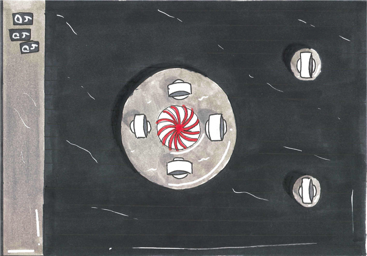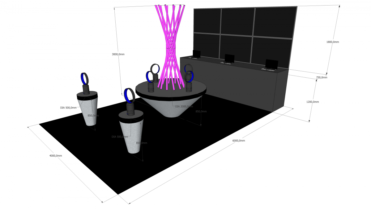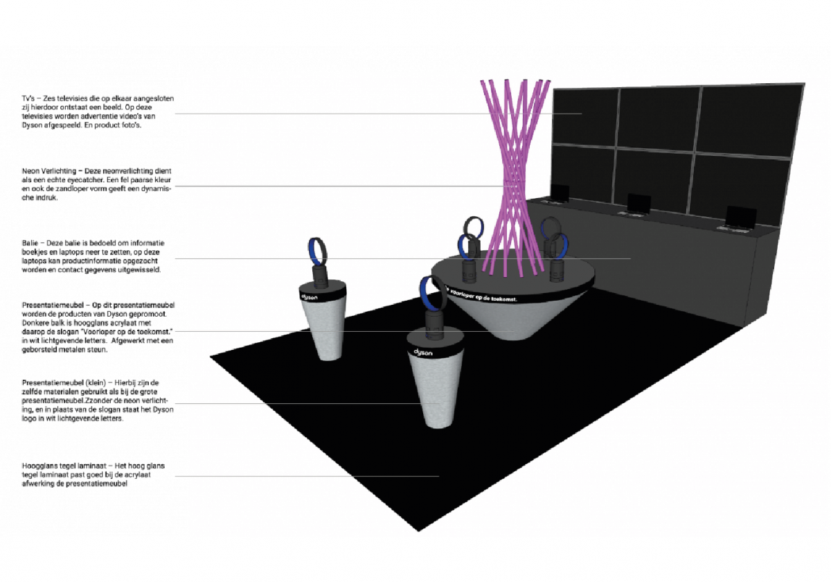 Omdat Dyson gebruikt maakt van cycloon technologie in haar producten. Heb ik dit duidelijjk teruggebracht in het ontwerp van het presentatiemeubel. De neonverlichting is gedraaid in een cycloonvorm hierdoor dient het als een waar eyecather. Op het presentatiemeubel worden producten van Dyson neer gezet. Achter in de winkel is een balie met daarop laptops hier kunnen klanten de producten bestellen. Op de tv’s worden product video’s getoond.